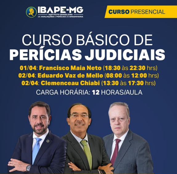 O IBAPE-MG, Instituto Brasileiro de Avaliações e Perícias de Engenharia em MG, abriu as inscrições para o Curso Básico de Perícias Judiciais, que contará com o Dr. Francisco Maia Neto no corpo docente, a ser realizado nos dias 01 e 02 de abril, com treinamento presencial para quem deseja atuar na área. |