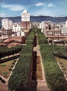 Rara imagem colorida, obtida do prédio da Feira Permanente de Amostras, exibindo toda a extensão da via, até a Avenida do Contorno. Destaque para o painel no prédio do Banco Financial da Produção SA próximo da Praça Sete.