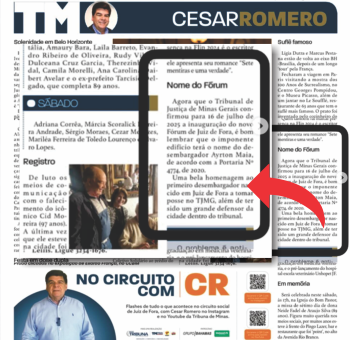 A coluna “No circuito com CR” do jornalista Cesar Romero, no jornal Tribuna de Minas, registrou a homenagem do Tribunal de Minas Gerais ao nosso saudoso e querido consultor jurídico, Desembargador Ayrton Maia, ao designar com seu nome para o novo edifício do fórum estadual em sua cidade natal, Juiz de Fora-MG.